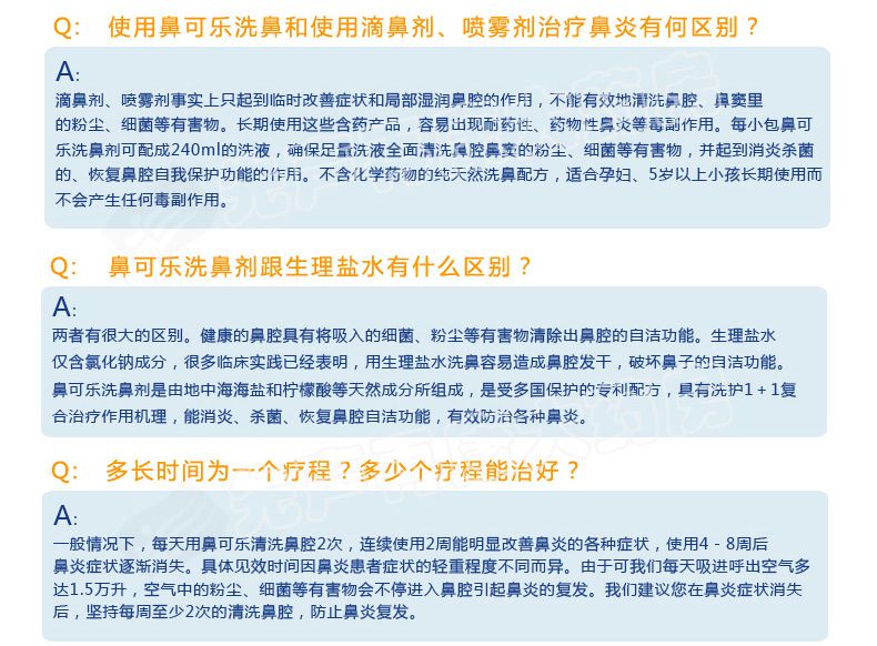 请仔细阅读说明书或在医务人员的指导下购买和使用。 【产品名称】 鼻可乐鼻腔清洗器 【规 格】 240ml+3.5g*10袋 (器+洗鼻剂10袋)【产品特点】 1.双正压反回流专利技术 2.不回流,不呛水 3.全面清洗鼻腔鼻窦 4.发明专利配方洗鼻剂 5.简单、安全、轻松、舒适 【适用范围】 1.用于鼻腔、鼻腔分泌物结痂清洗 2.萎缩性鼻炎药物清洗 3.鼻咽(癌)术后和化疗冲洗 4.清洗鼻部粘膜,避免因粘液在鼻腔的阻塞而导致感染,保护鼻腔粘膜 5.职业性吸入粉尘的鼻腔保健冲洗 【组 成】 1个洗鼻器 、10袋洗鼻剂 【使用方法】 1.加洁净的温水 2.加入洗鼻剂,水平移动摇匀 3.洗鼻 【批准文号】苏食药监械(准)字2011第2641167号 【生产厂家】 江苏泰德医药有限公司 |